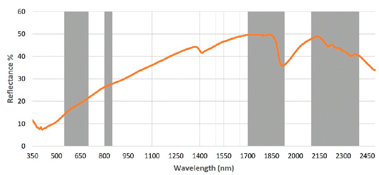 of the spectrum and in the narrower bands of the SWIR spectrum (between 1600
